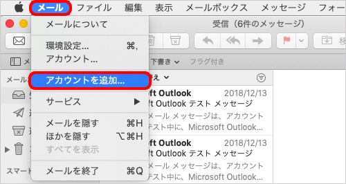 メニューバーの[メール]-[アカウントを追加]をクリックします。
