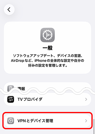 画面を下までスクロールし、[VPNとデバイス管理]をタップします。