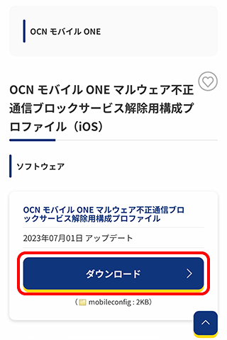 10. OCN モバイル ONE マルウェア不正通信ブロックサービス解除用構成プロファイルの[ダウンロード]をタップします。