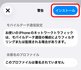 19. [警告]画面が表示されます。[インストール]をタップします。