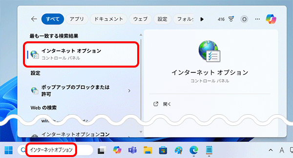 2. 検索欄に インターネットオプション と入力します。