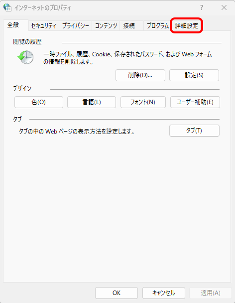 3. [インターネットのプロパティ]画面が表示されます。