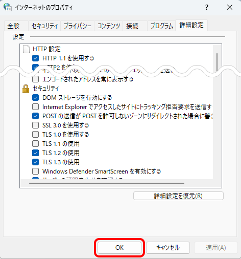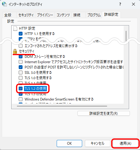 4. [セキュリティ]欄の[TLS 1.2の使用]にチェックします。